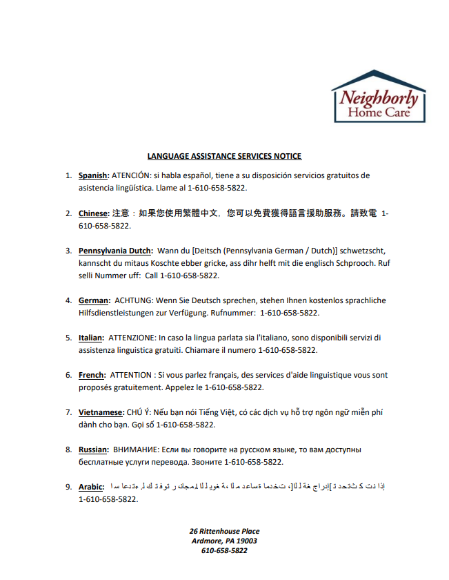 View Neighborly Home Care Language Assistance Services Notice PDF