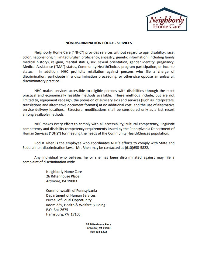 View Neighborly Home Care Non-Discrimination Policy Services PDF