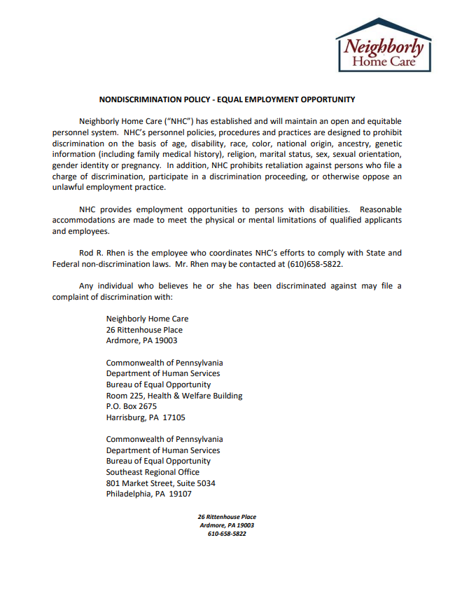 View Neighborly Home Care Non-Discrimination Policy – Equal Employment Opportunity PDF